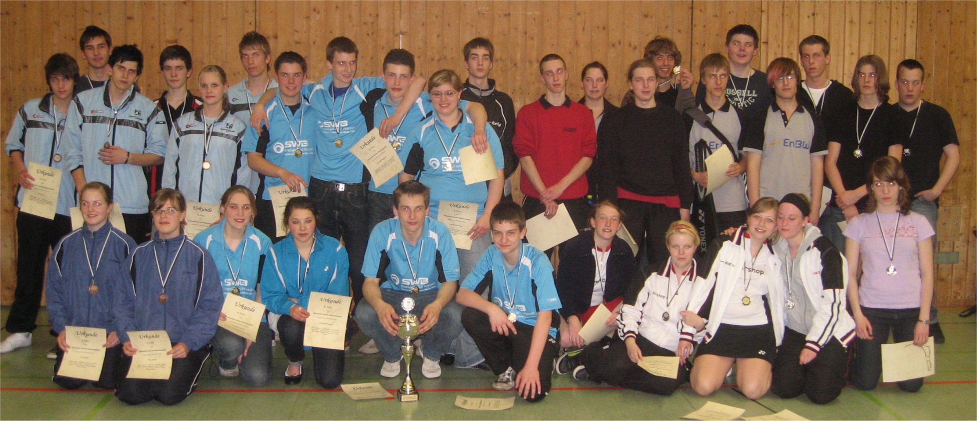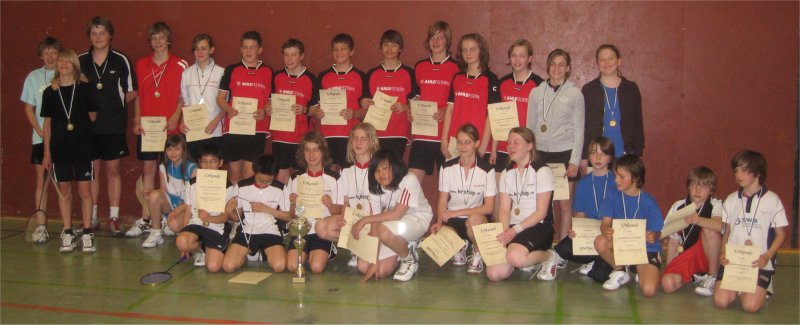Schüler-Normalklasse Am folgenden Tag traten die vier Staffelsieger der Schüler-Normalklassen Süd 2 in der gleichen Halle an: SV Frielingsdorf S1, 1. BC Beuel S2, 1. BC Düren S1 und BC SW Köln S1. Gespielt wurde nach dem Modus jeder gegen jeden. In der ersten Runde traf der 1. BC Düren auf SV Frielingsdorf und gewann mit einem knappen 5:3. Gleichzeitig spielte 1. BC Beuel gegen BC SW Köln. Auch dieses Spiel endete knapp mit 5:3 zu Gunsten des BC SW Köln. In der zweiten Runde trafen dann die beiden Sieger der ersten Runde, 1. BC Düren und BC SW Köln, aufeinander. Beide Mannschaften trennten sich in einem sehr spannenden Spiel mit einem Unentschieden. Im parallel verlaufenden Spiel sicherte sich der 1. BC Beuel mit einem 7:1 gegen den SV Frielingsdorf seinen ersten Sieg. In der dritten und letzten Runde spielten dann SV Frielingsdorf gegen den BC SW Köln und 1. BC Düren gegen den 1. BC Beuel. Hierbei gewannen die Kölner mit 7:1 gegen Frielingsdorf und Düren schlug Beuel mit 6:2. Damit waren alle Spiele beendet aber ein Sieger stand nicht direkt fest, da der 1. BC Düren und BC SW Köln punktgleich waren und das Spielverhältnis ausgewertet werden musste. Auf Grund eines einzigen mehr gewonnenen Spiels konnte der ausrichtende BC SW Köln den Turniersieg erringen. Der 1. BC Düren wurde knapp dahinter Zweiter. Der 1. BC Beuel holte einen guten 3. Platz und SV Frielingsdorf wurde Vierter. Damit endete der Alex-Hecker-Bezirkspokal mit sehr vielen spannenden und guten Spielen. Abschlusstabelle