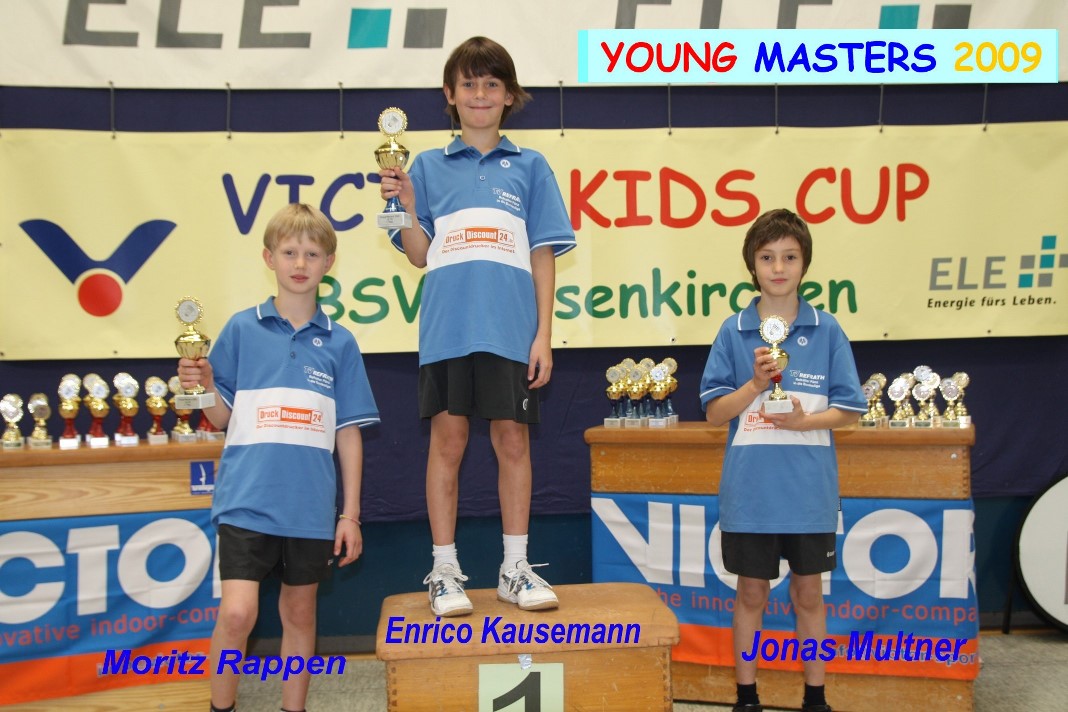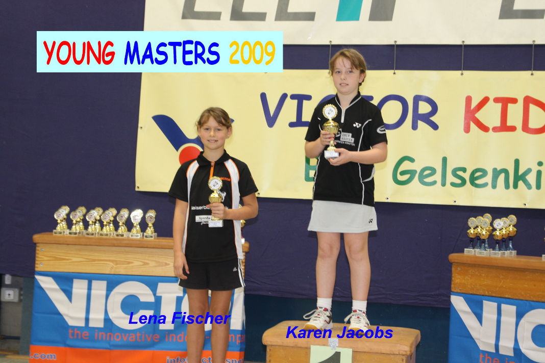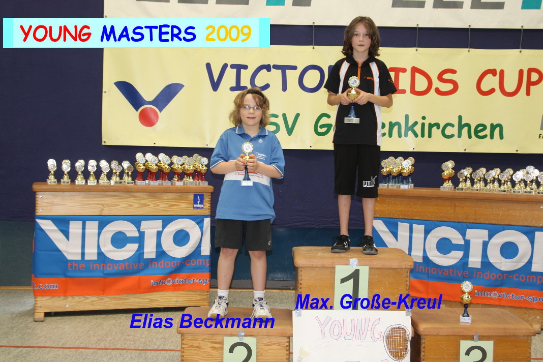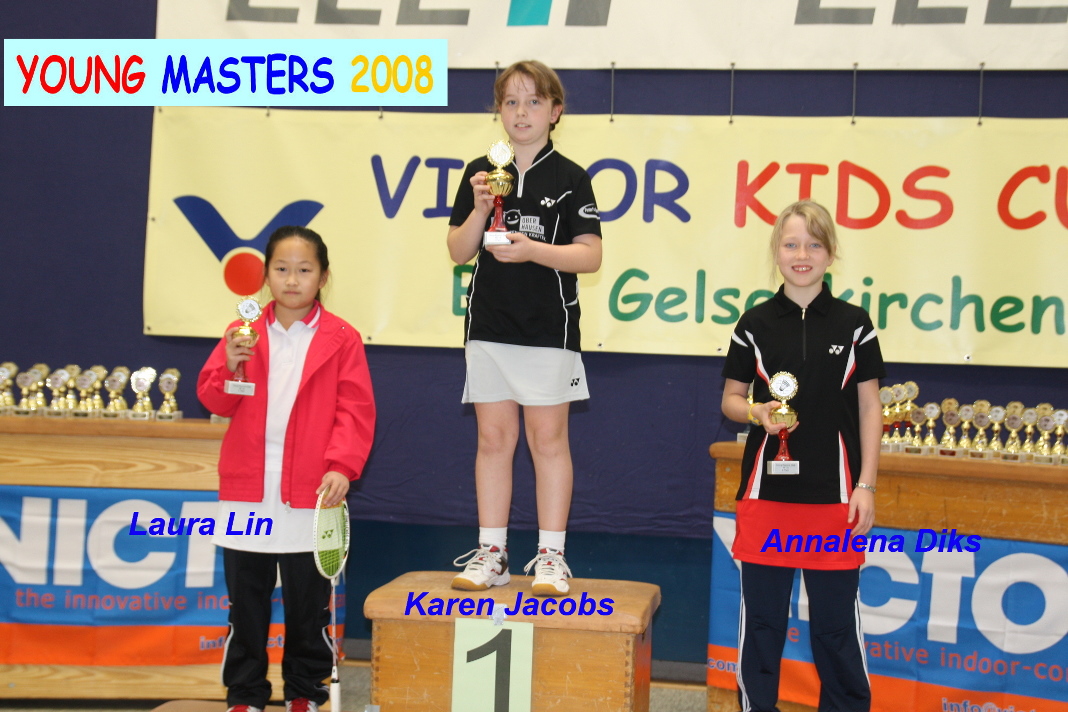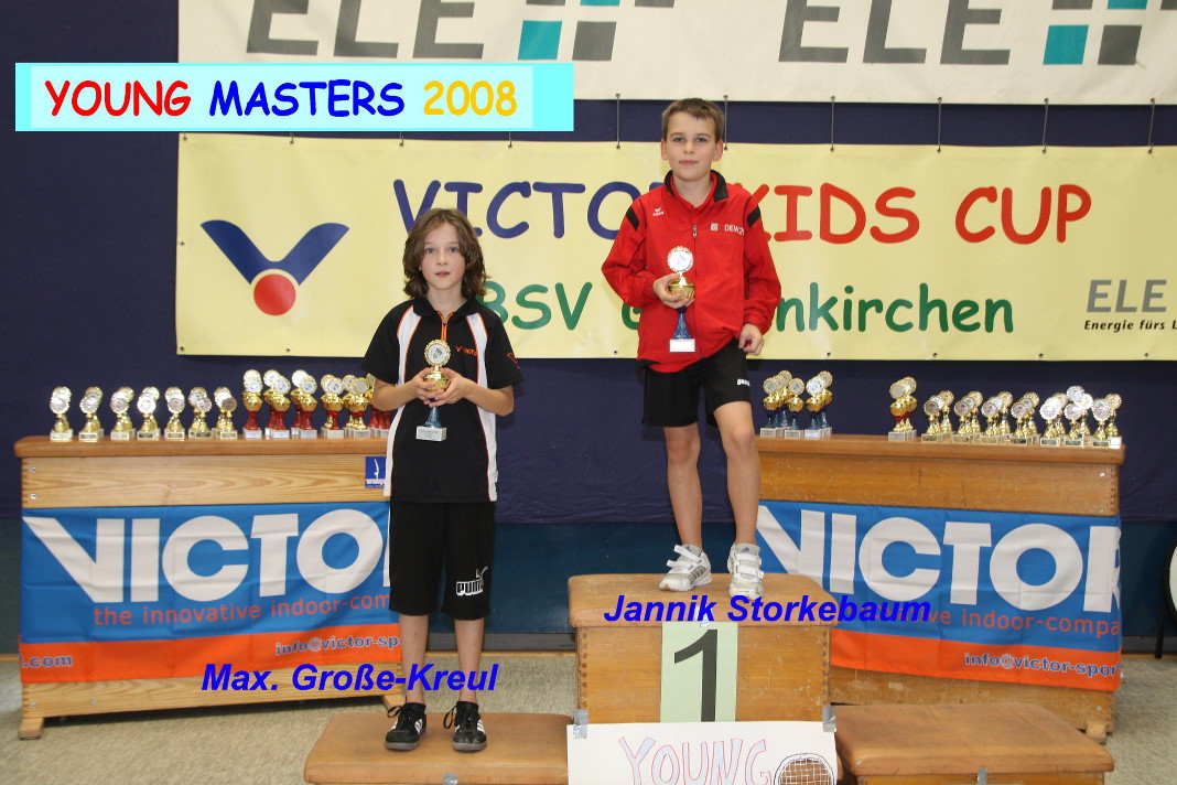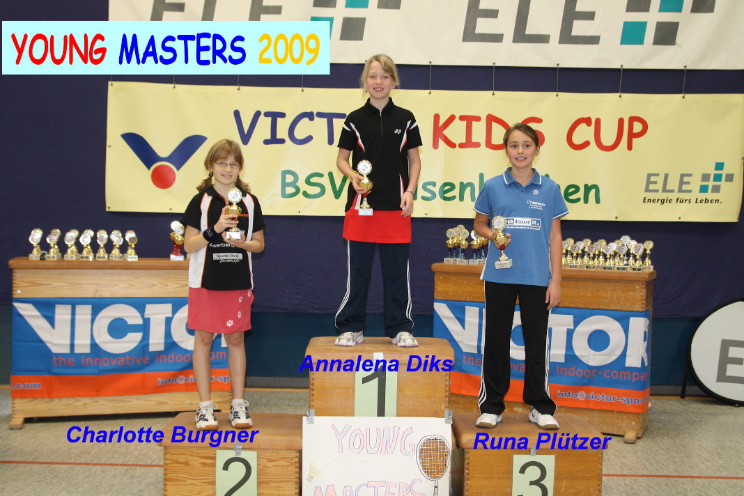 Im Vorfeld wurden die alten Turnierergebnisse meist mit Hilfe der entsprechenden Ausrichter der vergangenen Turniere zusammen gestellt, Punkte errechnet und schließlich die Resultate in der Abschlusstabelle zusammengetragen und veröffentlicht. Im Turnierverlauf am Sonntag konnten dann mehrere Siegerehrungen vorgenommen und den anwesenden Spielern und Spielerinnen ihre Pokale überreicht werden. Leider waren – vermutlich Urlaubsgründe und weite Wege – nicht alle Siegerinnen und Sieger erschienen. Teilweise nahmen stattdessen die Vereinsvertreter die Pokale für ihre Schützlinge mit nach Hause. Die Sieger der Young Masters Serie waren auch gleich wieder beim VICTOR Kids Cup erfolgreich. So belegten Lena Fischer, Karen Jacobs und Laura Lin die ersten drei Plätze in der AK U10. Jannik Storkebaum und Elias Beckmann standen in der AK U11 wieder auf dem Treppchen. Enrico Kausemann schaffte den zweiten Platz in der AK U10. Runa Plützer und Annalena Diks teilten sich die zwei ersten Plätze in der AK U11. Im kommenden Jahr beginnt die neue Young Masters Turnierserie im Frühjahr. Alle Ergebnisse der Young