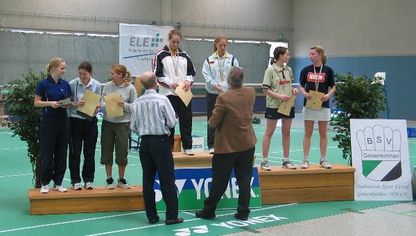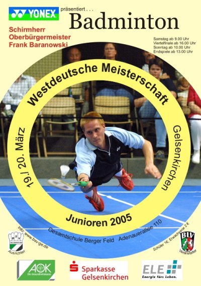 „BSV überzeugt mit vorbildlicher Arbeit“ Bericht von Miles Eggers lautete der Titel der WAZ-Berichterstattung in der Woche nach der Westdeutschen Meisterschaften U 22, die am 19./20. März 2005 vom BSV Gelsenkirchen im Schatten der „Arena AufSchalke“ präsentiert wurde. Bereits im Vorfeld der Veranstaltung wurde von der Buerschen Zeitung und der WAZ nach einer eigens einberufenen Pressekonferenz ausführlich berichtet. Hauptaugenmerk legten die Journalisten auf die Arbeit der ehrenamtlichen HelferInnen des „kleinen“ BSV, der sich erstmalig eine größere Veranstaltung zutraute. In der Tat trugen neben den Sponsoren (Sparkasse Gelsenkirchen, ELE Emscher Lippe Energie GmbH, AOK u.v.a.) über ein Drittel der erwachsenen Vereinsmitglieder mit Organisationstalent, Geschick und mit viel Spaß an der Sache zum guten Gelingen der Veranstaltung bei. Besonders die „kleinen Hände" des Vereins, die Schüler im Alter von 7 - 14 Jahren, waren an beiden Turniertagen bei allen (!) Spielen ständig dabei (als Bediener der Zähltafeln) und beobachteten am Spielfeldrand die Künste der Aktiven. Für genau die-se Gruppe sucht der BSV übrigens noch dringend eine Trainerin oder einen Trainer. Die gut und vor allem preisgünstige Cafeteria versorgte mit allem für das leibliche Wohl Notwendige. Das Know-how der Turnierleitung schließlich sorgte für einen reibungslosen Turnierablauf. Besondere Erwähnung war der Presse die Herrichtung der Halle wert: Ein für Gelsenkirchener Verhältnisse besonderes Flair sei entstanden, eine kleine „Badminton-Arena im Schatten der eigentlichen Arena“ (gemeint ist die Arena „Auf Schalke“). So kam die Gelsenkirchener Presse zu dem Schluß „“Als Vertreter einer Randsportart wußte der BSV zweifelsohne Großes zu leisten – die Resonanz darf als Indiz heran-gezogen werden. … Prominentester Besucher war dabei Oberbürgermeister Frank Baranowski, der in seiner Rede die Arbeit des BSV ausdrücklich lobte.“ (WAZ, 21.3.05) zu den Fotos